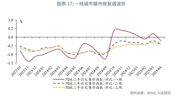 2025年4月,一线城市二手住宅销售价格指数环比再度转负;4月下旬以来,上海、深圳、广州中原经理指数均回落至“930”新政之前水平,楼市修复动力走弱或对居民财产性收入形成拖累。