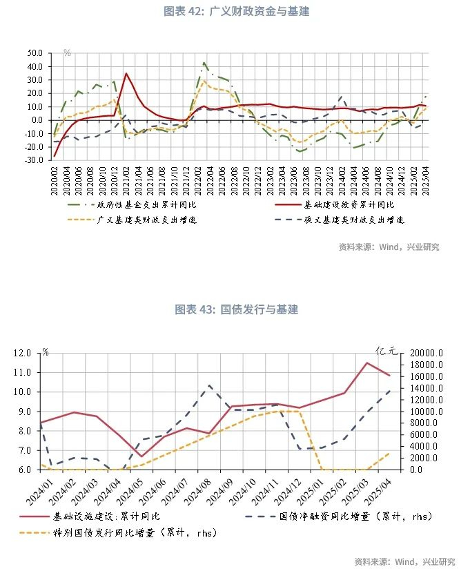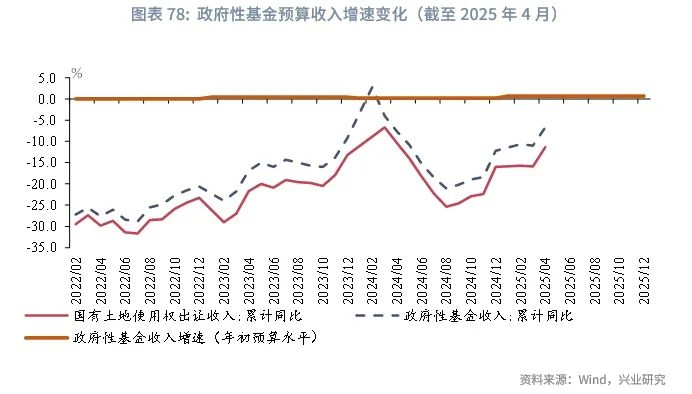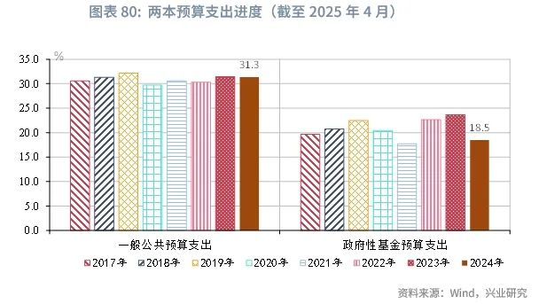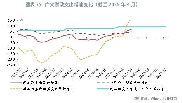 从财政收支运行来看,2024年1-4月财政政策发力适度靠前,国债发行前置,使广义财政支出增速较高。截至2025年4月,广义财政支出累计同比增速7.2%。其中,一般公共预算支出、政府性基金支出累计同比增速分别上升至4.6%、17.7%。