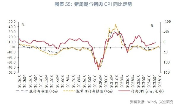 作为食品CPI最重要的影响因素之一,猪肉价格主要受到供给因素的影响。2024年第二季度以来,能繁母猪和生猪存栏数同比增速开始回升,2025年第一季度同比增速双双转正,表明生猪供给能力持续修复。考虑到存量大约领先出栏6个月左右,本轮供给回暖将对下半年猪肉价格形成压制,猪肉CPI对整体物价的拖累仍将持续。