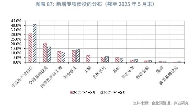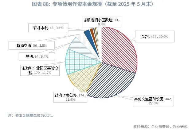从投资领域来看,2025年专项债投向领域实施“负面清单”管理,未纳入“负面清单”的项目均可申请专项债券资金。规模方面,相较2024年同期,交通基础设施、土储领域的专项债规模占比明显增加,而市政及产业园区领域则有所下降。2025年1-5月专项债项目投向前五位的领域为:市政及产业园区、土地储备、棚户区改造、其他交通基础设施。专项债用作资本金方面,2025年扩大专项债券用作项目资本金范围,实行“正面清单”管理。扩展专项债券用作项目资本金范围,新兴产业基础设施、民生保障成为新增重点,同时提高专项债券用作项目资本金的比例。相较2024年同期,2025年1-5月专项债用作资本金的金额及比例均有明显上升,约占样本专项债规模的10.7%,2024年同期约为6.3%,主要集中在传统交通领域,包含铁路、其他交通基础设施、政府收费公路,其次是市政和产业园区基础设施。