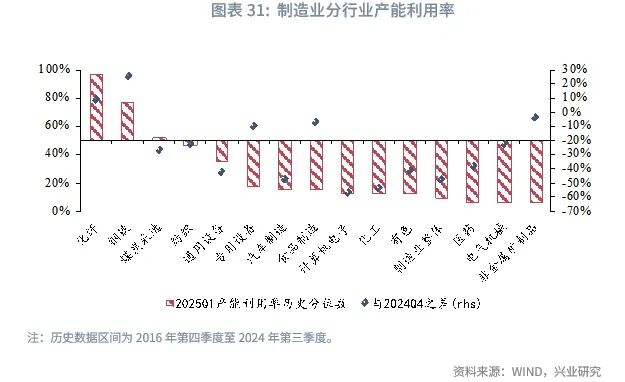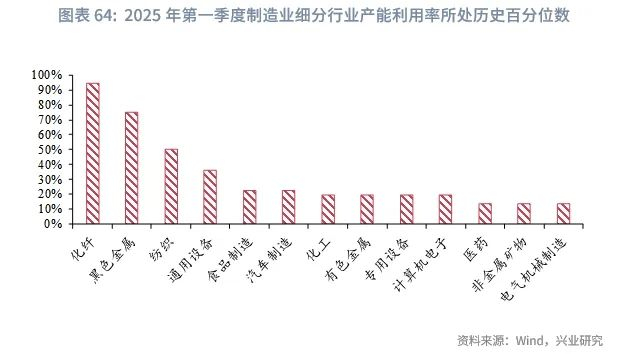 二是制造业产能利用率回落,整治“内卷式”竞争过程中产能出清可能带来投资放缓。2025年第一季度制造业产能利用率录得74.1%,较2024年第四季度下降2.3个百分点,回落幅度大于2024年同期的2.2个百分点。制造业整体的产能利用率仅处于9.4%的历史分位数水平。分行业来看,大部分制造业的产能利用历史分位数水平都在50%之下,其中计算机电子、化工、汽车制造产能利用率录得较大幅度回落。同时,在美国加征关税的影响下,对美国市场依赖度较高的行业的产能利用率可能进一步下行。