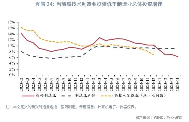三是高技术制造业投资的回落。自2018年统计局披露高技术制造业投资以来至2024年9月,高技术制造业投资增速始终高于制造业整体投资增速,高技术制造业投资是驱动制造业投资增长的重要动能。而随着高技术制造业投资增速逐步回落,当前高技术制造业投资累计同比已低于整体制造业投资增速。由于2025年起统计局不再披露高技术制造业投资增速,我们将《高技术产业(制造业)分类》中涉及较多的医药制造、专用设备、计算机电子和仪器仪表定义为新兴制造业,将其投资情况近似高技术制造业的投资情况。2025年1-4月,以上四个新兴制造业的投资累计增速为6.3%,低于制造业8.8%的整体增速。