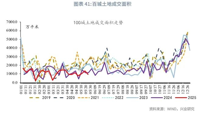 从供给端来看,在当前房地产库存水平仍高的情况下,“严控增量、优化存量”仍是当前和下一阶段房地产供给端的主要政策导向。在土地供应仍延续收紧态势下,2025年1-4月新开工面积累计下降23.7%,跌幅较2024年的23%仍有扩大。2025年土地成交量仍较低迷,1-5与全国百城土地成交面积同比下降6.5%。土地成交一般领先投资端2-3个季度,因此2025年下半年新开工难有明显改善,由此拖累整体房地产投资。值得一提的是,2025年土地市场呈现较为明显的分化态势,一线城市土地成交较为活跃,优质地块入市显著推升了成交均价。根据中指数据库,一线城市1-5月成交建设用地面积、成交土地均价、土地出让金额分别同比增长0.6%、63.3%、25.9%;1-5月二线、三线城市成交建设用地面积同比分别录得-4.5%、-12.1%,土地出让金额同比分别录得20.1%、-5.7%。高能级城市土地成交金额提升或使土地购置费用跌幅有所收窄。