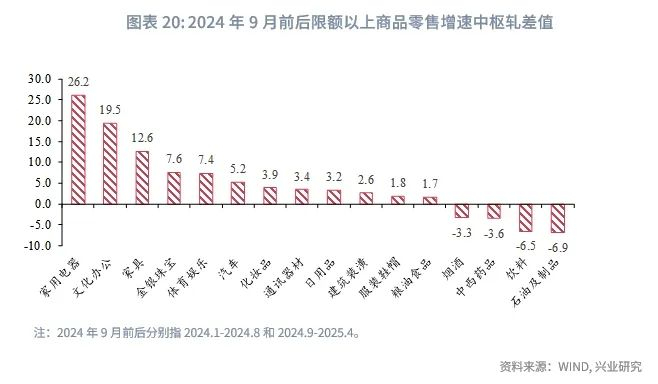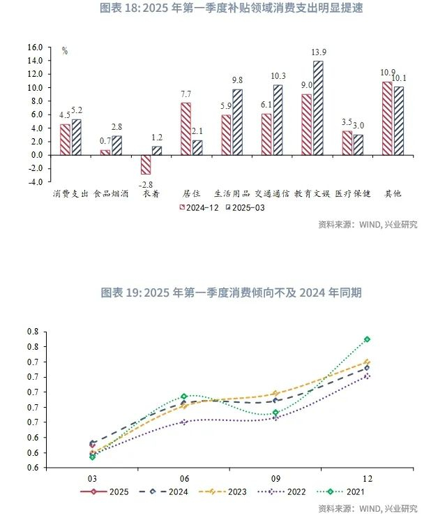 在政策支持下,居民消费结构向换新补贴领域倾斜。不同于2009年上一轮以旧换新,本轮以旧换新通过对补贴品类扩容的方式实现政策效用的接续。2025年伊始,发改委和财政部印发《关于2025年加力扩围实施大规模设备更新和消费品以旧换新政策的通知》,在2024年基础上,将更多家电产品纳入补贴范围,并发放手机等数码产品购新补贴。政策出台后,2025年第一季度补贴领域的消费支出明显提速,生活用品和服务、交通通信、教育文娱支出同比增速较2024年第四季度显著提高。值得注意的是,尽管补贴领域消费支出增加,但第一季度整体消费倾向(全部消费支出除以可支配收入)并未相应提升,不及尚未出台补贴的2024年第一季度。对比2024年9月前后(2024.1-2024.8和2024.9-2025.4)限额以上商品零售增速中枢[1],家用电器等商品增速中枢大幅上行,但是饮料、药品、烟酒等非补贴消费品增速中枢不及政策出台前。