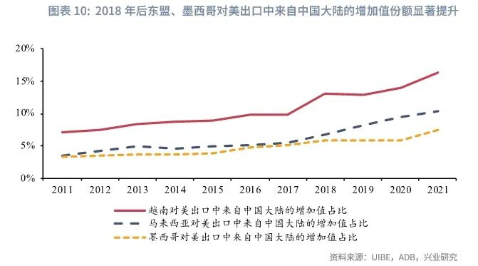 对新兴经济体的出口高增一方面来自应对美国高关税下的“抢转口”,另一方面也来自我国和新兴经济体之间愈发紧密的产业链关联。自2018年中美贸易摩擦后,东盟、墨西哥等新兴经济体的对美出口中,来自中国大陆提供的增加值份额显著提升。这表明在美国提高对华关税后,我国开始更多地通过和新兴经济体以产业链合作的方式向美国间接出口,即我国向新兴经济体出口中间产品、新兴经济体负责下游生产和最终产品的出口。