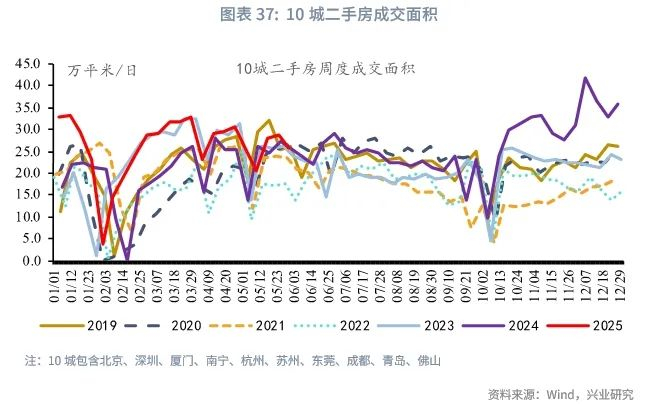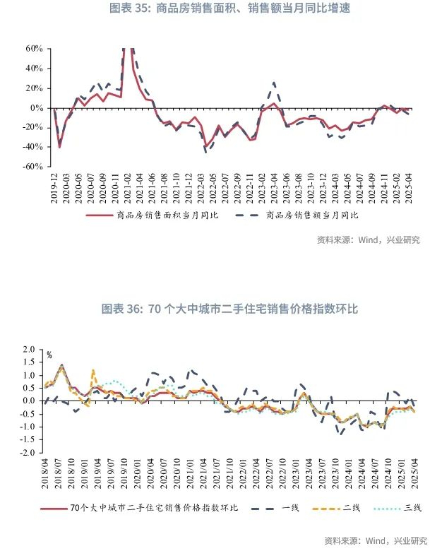 从销售端来看,房屋销售在第二季度有所退坡,楼市复苏仍有波折。新房方面,2025年1-4月全国商品房销售面积累计下降2.8%,较2024年跌幅明显收窄。但全国商品房销售面积当月降幅在4月又重新扩大,5月30城新房销售面积也下降3.4%。二手房方面,2025年以来整体延续“以价换量”趋势,成交量表现优于新房。但进入第二季度,二手房市场亦有所回落, 4月一线城市二手住宅价格环比再度转负,5月二手房成交量退坡,样本10城5月二手房成交面积同比回落17.8个百分点至1.7%,其中北京、深圳、杭州、成都等一线和强二线城市的二手房销量同比在5月都有不同程度的回落。