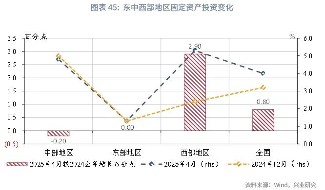 随着高风险地区投资的恢复,西部地区成为2025年固定资产投资加快的重要引擎。截至2025年4月,全国固定资产投资增速较2024年全年提升0.8个百分点,其中,西部、中部、东部地区分别提升2.9、-0.2、0.0个百分点。