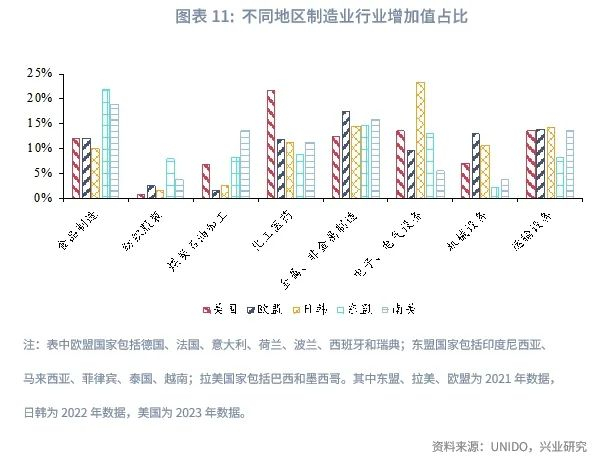 随着特朗普第二次上台以来贸易不确定进一步加剧,我国同新兴经济体的产业链合作模式或将进一步加快,这一模式也将持续推动我国对新兴经济体的中间品出口。从不同经济体的制造业结构来看,东盟的食品制造、服装纺织、电子电气设备增加值占比相比其他地区较高,拉美的煤炭石油加工、金属非金属制造、运输设备增加值占比相对其他地区较高。因此,未来东盟或更多地承接我国服装纺织、电子电气行业的生产环节,拉美地区或更多地承接运输设备等行业的生产环节,我国对这些地区相应行业的中间产品出口也将进一步扩大。