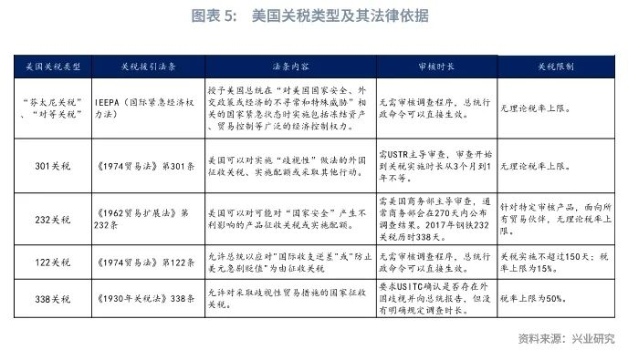 虽然特朗普“对等关税”和“芬太尼关税”受到一定阻力,但特朗普仍然可以利用其他法律权限征收类似的关税。在其他可选的关税类型中,301和232关税已被特朗普政府实施,但这两类关税都需要相关部门发起审查程序,从审查发起到关税落地历时从3个月到1年不等。其中,301关税审查对象是特定经济体的产品清单,232关税针对的是特定行业,美国在短期内较难通过301和232条款发起类似于“对等关税”的全球普遍性关税。当前未被实施的122条款和338条款关税未来则可能被特朗普政府采用。 122和338关税都没有严格的审核程序,且生效时间较快,可以成为特朗普政府在短期内替代“对等关税”和“芬太尼关税”的方案。但122和338关税也存在一定的限制,122关税实施日期不超过150天,税率上限为15%;338关税税率上限则为50%。