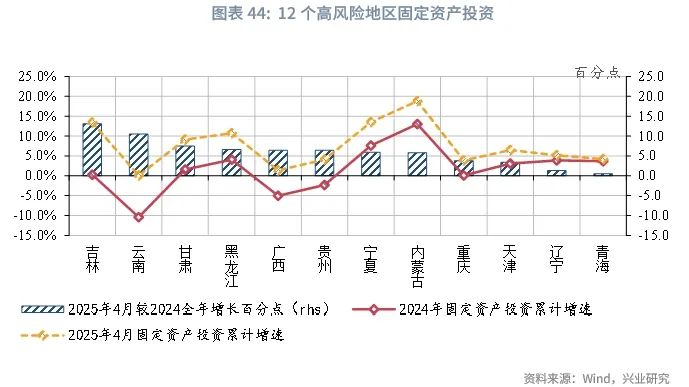 二是高风险省份“轻装上阵”,固定资产投资增速表现亮眼。由于分省的基础设施投资增速数据披露不全,因而这里主要考察各地区固定资产投资增速。2025年以来12个债务高风险“重点地区”[10]投资表现亮眼。截至2025年4月,12个债务高风险地区中,有8个省份固定资产投资增速较2024年全年提升5个百分点及以上。