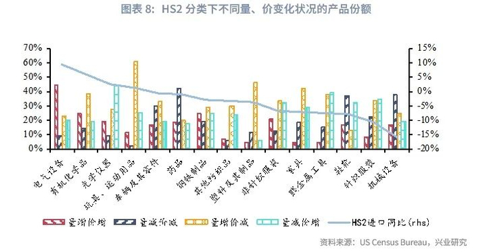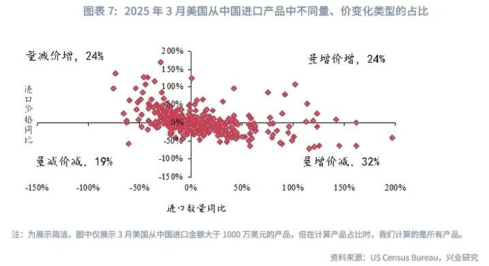 从产业基础来看,面对美国高关税,我国出口产品表现出较强的议价能力。3月份我国对美国的出口数据显示,在20%“芬太尼关税”的影响下,我国出口当月同比仍录得9.1%的高增速。量、价分解来看,3月以价换量的产品占比最高,约占全部进口金额的32%。约占美国从我国进口48%的产品在加征关税后依然提高了价格,其中24%的产品量、价同升,24%的产品量减价增,表明在加征20%关税情景下,我国仍有较大比例的对美出口产品具有较强的议价能力。尤其是在美国对我国进口依赖度大于80%的产品中,价格提升的产品份额达到了81%。但也需要指出的是,加征20%关税下我国较多产品的价格优势已被削弱,且中长期内产能可能向其他经济体转移,进而影响我国出口品的议价能力,当前的税率水平仍给我国的制造业竞争力带来较大挑战。