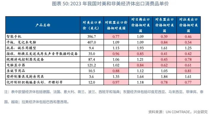 从品质来看,以美国为代表的发达经济体购买力更强,对于优质高价产品有更高的需求。我们利用2023年UN COMTRADE数据库中我国对不同经济体出口产品的出口金额和数量数据,计算了我国对美国和非美经济体同类产品(相同HS6位产品)的单价差异。在对美出口的主要消费品中,对东盟和拉美的出口单价要显著低于对美出口单价,对欧盟和日韩的出口单价同美国较为接近。这也表明,在相对高价消费品的出口上,新兴经济体的市场需求尚无法完全替代美国市场。
