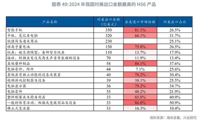 我国的出口结构也可以佐证这一点。我国对美国、日本等发达经济体的出口以最终产品为主,而对于东盟、墨西哥等发展中经济体的出口则以中间产品为主。其中,我国对美国出口中最终产品的占比最高,占比达70.5%,明显高于日本、德国等发达经济体。从我国对美出口金额最高的细分产品来看,其中大部分为最终消费品。因此,相较于美国对最终产品的较大需求,非美经济体能够承接的消费品市场空间则相对有限。