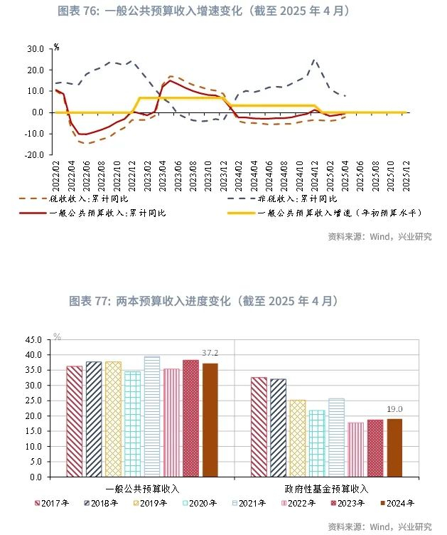 收入方面,一般公共预算收入端呈现修复态势,但物价低迷制约税收增长,预计全年收入预算执行率或略低于100%。2025年年初预算收入增速0.1%,而2025年1-4月财政收入累计同比-0.4%。其中,税收收入-2.1%,非税收入7.7%,非税收入增长较快。而年初预算水平下税收收入、非税收入全年增速分别约3.7%、-14.2%,表明税收收入增长不及预期。在物价压力持续的情况下,下半年税收收入增长继续面临挑战。4月财政收入进度约36.7%,低于2024年同期0.6个百分点。若全年一般公共预算收入增速约为-0.5%,预计全年收入预算执行率或略低于100%,约为99%。
