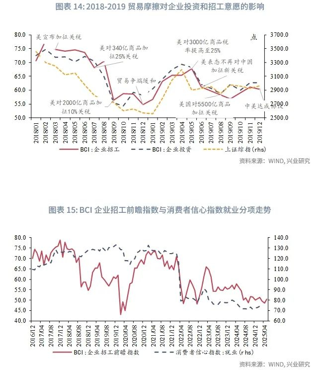 当前尽管城镇调查失业率处于相对低位,但结构性就业压力较大。一方面,2025年1-4月,16-24岁劳动力失业率显著高于上年同期,青年群体就业压力显著;本地户籍人口失业率持续高于外来户籍和外来农业户籍人口失业率,或是由于外来户籍人口逆城市化流动而无法被有效统计。另一方面,关税不确定性也会影响就业。通过测算各制造业营收中对美出口敞口,乘以劳动报酬在投入结构中占比,估算结果显示,受关税直接影响的群体规模约占城镇就业人数的0.3%左右。同时上一轮贸易摩擦的经验显示,谈判进程或出现反复,贸易的不确定性会对企业生产经营产生影响。2018-2019年期间,BCI企业投资和招工前瞻指数整体震荡回落。考虑到关税带来的扰动,抢出口和抢转口退坡之后,居民工资性和经营性收入增速仍有下行压力,或低于2025年第一季度水平。