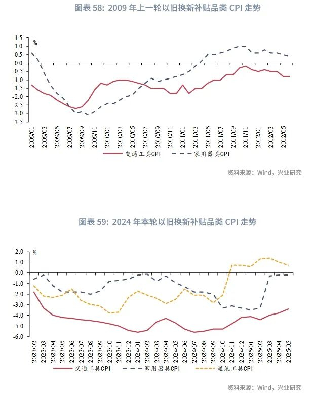 耐用消费品方面,2009年上一轮以旧换新政策中,家电以旧换新持续期为2009年6月至2011年12月,汽车以旧换新持续期为2009年6月至2010年12月。上一轮政策期内,家用器具和交通工具CPI同比整体呈现回暖走势。2024年8月本轮以旧换新加力实施以来,通讯工具CPI同比快速转正,家用器具CPI同比跌幅明显收窄,交通工具CPI小幅回暖。考虑到基数的变化,第四季度耐用消费品CPI同比或有回落压力。