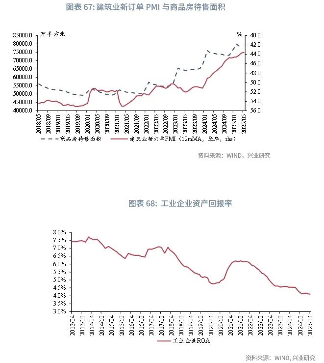 企业方面,企业信贷增速或延续低位运行。从融资需求来看,建筑业方面,2025年以来各月份建筑业新订单PMI均低于2024年同期,5月建筑业新订单PMI录得43.3%,为有数据以来同期数据的最低水平。商品房待售面积不断走高可能是目前建筑业新订单中枢回落的主要原因,由于当前新房去化速度较慢,建筑业相关融资需求或延续低迷。工业方面,我国正处于朱格拉周期的下行期,2025年第一季度工业产能利用率为74.1%,处于历史较低水平。4月工业企业资产回报率(滚动12个月)录得4.1%,工业企业盈利继续筑底。产能利用率偏低和盈利承压导致企业扩产需求较弱,融资需求不强。