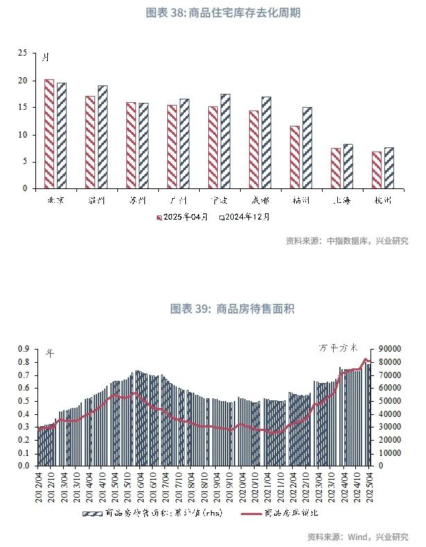 从房屋库存来看,当前楼市库存逐步去化,但仍面临较大的去库压力。克而瑞报告显示,2025 年 1 月末 50 城新建商品住宅狭义库存同比下降11%,按 12 个月测算去化周期 2025 年 1 月末为 21.5 个月,较2024年9月高点下降2.5个月[5]。根据中指数据库数据,2025年4月有数据的9个城市的商品住宅库存去化周期为13.2个月,较2024年12月下降了1.3个月[6]。但整体商品房库存水平仍处高位,2025年4月我国商品房待售面积达7.8亿平方米,仍较2024年12月上升了0.3亿平方米,为历史同期最高水平。