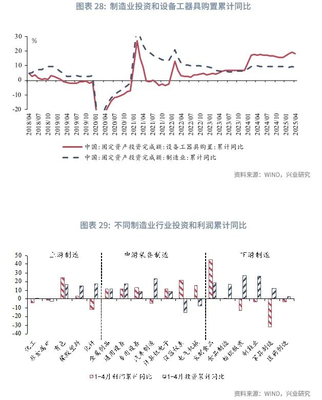 2025年以来,制造业投资在“两新”政策加力扩围的推动下保持较高增速,1-4月制造业投资累计同比录得8.8%。大规模设备更新扩投资成效突出,1-4月份设备购置投资增长18.2%,对全部投资增长贡献率达到了64.5%。在设备更新政策的驱动下,2025年1-4月利润改善的行业也更多地集中在中游装备制造业,2025年1-4月金属制品、通用设备、专用设备制造业、仪器仪表制造业利润累计增速分别为11.1%、11.7%、13.2%和22%,高于制造业投资8.6%的利润增速。而从投资增速来看,1-4月投资增速靠前的行业分布则更为广泛,包括上游的化纤、有色,中游的其他运输设备、汽车制造、通用设备,下游的纺织服装、制鞋业和农副食品制造。2024年9月20日工业和信息化部印发《工业重点行业领域设备更新和技术改造指南》[4],其中包含了27 个工业重点行业领域,当前投资增速较快的制造业行业皆在其中,也反映出设备更新政策对各制造业行业设备更新和技术改造投资形成了广泛的支撑。