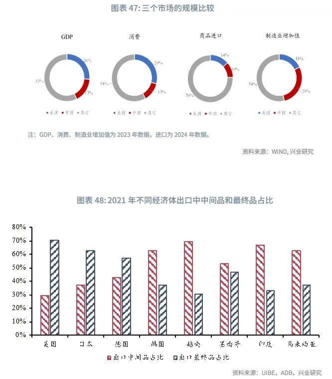 国内市场、美国市场、非美市场之间存在着诸多差异。从规模来看,2023年美国、中国和其它经济体占全球GDP的比例分别是26%、17%和57%,但美国消费占优,中国生产占优。美国消费占全球的比例为29%,高于其GDP占比;中国制造业增加值占全球的比例是29%,显著高于GDP占比。虽然美国的进口规模仅占全球的14%,显著低于其GDP占比,但这是因为全球商品进出口中包含了大量中间产品进出口,而一些新兴经济体承担着进口中间品并出口最终品的职能,使其实际贸易需求被高估。