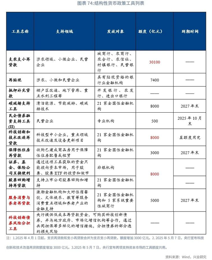 从结构性货币政策工具来看,2025年下半年,科技创新债券风险分担工具有望落地。2025年5月7日,人民银行将结构性货币政策工具的利率下调25bp,包括PSL和再贷款再贴现利率。2025年上半年,人民银行对结构性货币政策工具的品种和额度进行了扩充,对部分存量工具进行了整合,主要包括以下方面:一是支农再贷款和支小再贷款合并为支农支小再贷款,额度增加3000亿元;二是科技创新和技术改造再贷款额度增加3000亿元;三是两项支持资本市场的工具额度共用,此外,4月央行对其他金融性公司债权上升3700亿元,可能对应央行向中央汇金提供的再贷款规模;四是新设服务消费与养老再贷款,额度5000亿元;五是科技创新债券风险分担工具,具体安排和额度尚未披露,预计将于下半年落地。