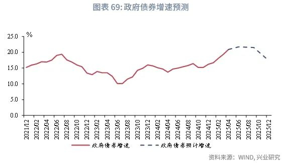 从政府债券来看,2025年下半年政府债券增速预计呈先升后降。一是2025年政府债融资节奏快于2024年,第三季度政府债净融资规模预计为全年最高峰。二是2024年11月十四届全国人大常委会第十二次会议表决通过《全国人民代表大会常务委员会关于批准〈国务院关于提请审议增加地方政府债务限额置换存量隐性债务的议案〉的决议》,确定了置换存量隐性债务的方案,新增的再融资债推高了2024年第四季度政府债基数。由于节奏错位,预计下半年政府债券增速先升后降。