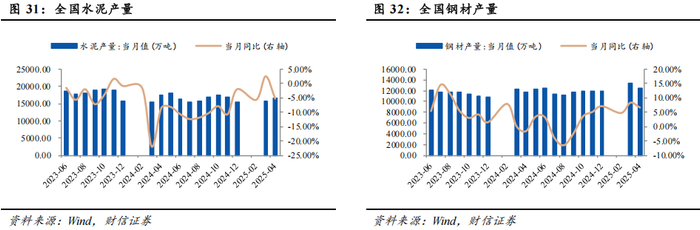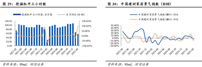 截至2025年2月,全国挖掘机开工小时数当月同比增加100.70%。截至2025年4月,建材家居景气指数同比下降3.95%。截至2025年4月,家具类零售额同比增加26.90%。截至2025年4月,家用电器和音像器材类零售额同比增加38.80%。截至2025年4月,水泥产量同比减少5.30%。截至2025年4月,钢材产量同比增加6.60%。