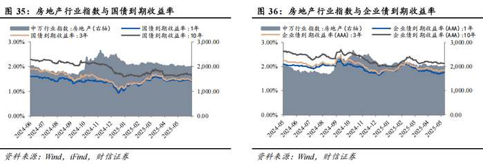 近年以来,国债与企业债收益率与房地产行业指数走势基本一致。房地产行业作为国民经济的重要组成部分,一方面行业景气度欠佳可能使得经济基本面承压;另一方面可能推动央行降准降息,带动无风险利率下行。截至2025年6月6日,1年期国债到期收益率周环比下跌4.50BP,3年期国债到期收益率周环比下跌4.23BP,10年期国债到期收益率周环比下跌1.65BP;AAA企业债中,1年期企业债到期收益率周环比上涨1.10BP,3年期企业债到期收益率周环比下跌0.28BP,10年期企业债到期收益率周环比下跌1.11BP。