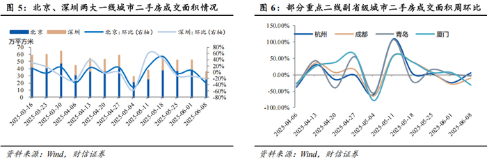 二手房成交高频数据:(1)一线城市:二手房周度成交面积方面,2025年6月2日至2025年6月8日,北京周环比减少35.11%;深圳周环比减少20.82%。年内二手房累计成交面积方面,截至2025年6月8日,北京同比增加22.87%;深圳同比增加45.20%。(2)部分重点二线城市:二手房周度成交面积方面,2025年6月2日至2025年6月8日,杭州周环比增加5.77%;成都周环比减少10.44%;青岛周环比减少3.75%;厦门周环比减少31.04%。年内二手房累计成交面积方面,截至2025年6月8日,杭州同比增加36.09%;成都同比增加20.92%;青岛同比减少1.03%;厦门同比增加131.19%。