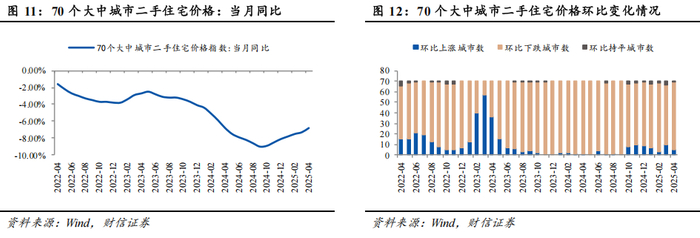 (2)二手住宅价格月度动态:截至2025年4月,70个大中城市二手住宅价格指数同比下跌6.80%。70个大中城市中,5个城市环比上涨,1个城市环比持平,64个城市环比下跌。按城市能级分,一线城市二手住宅价格指数同比下跌3.20%,二线城市同比下跌6.50%,三线城市同比下跌7.40%。按建筑面积分,90平方米及以下二手住宅价格指数同比下跌7.00%,90-144平方米同比下跌6.60%,144平方米以上同比下跌6.80%。