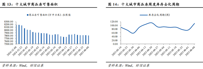 (1)商品房库存情况:截至2025年6月8日,十大城市商品房可售面积为7798.60万平方米,当周成交面积70.50万平方米,库存去化周期为110.63周。
