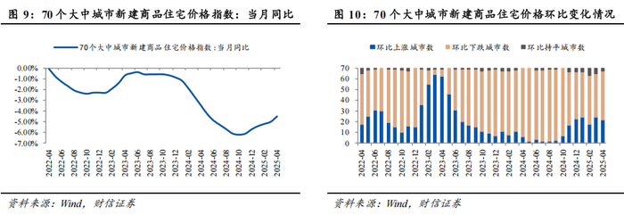 (1)新建商品住宅价格月度动态:截至2025年4月,70个大中城市新建商品住宅价格指数同比下跌4.50%。70个大中城市中,22个城市环比上涨,45个城市环比下跌,3个城市环比持平。按城市能级分,一线城市新建商品住宅价格指数同比下跌2.10%,二线城市同比下跌3.90%,三线城市同比下跌5.40%。按建筑面积分,90平方米及以下新建商品住宅价格指数同比下跌4.60%,90-144平方米同比下跌4.50%,144平方米以上同比下跌4.70%。