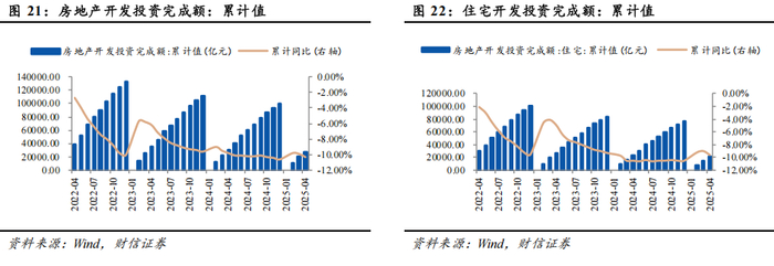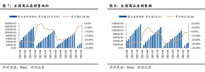 (4)全国商品房月度销售情况:截至2025年4月,全国商品房累计成交面积28261.74万平方米,同比减少2.80%;全国商品房累计成交额27034.61亿元,同比减少3.20%。