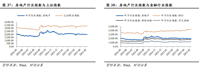 房地产板块是上证综指成份中所占权重较高的一部分,因此房地产行业的景气度与上证综指显著正相关,房地产行业指数与上证综指走势基本一致;此外,同为上证综指主要构成的金融板块与房地产板块也存在较强的相关性。截至2025年6月6日,房地产板块周环比上涨0.86%,上证综合指数周环比上涨1.13%,银行板块周环比上涨1.56%。