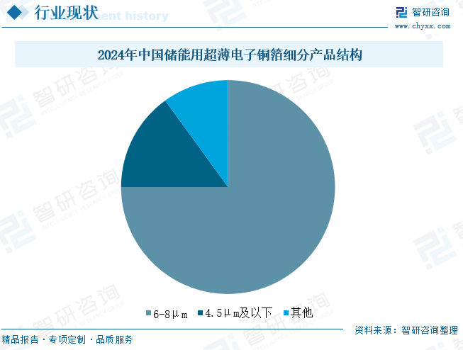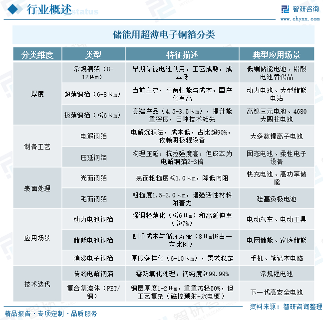 从产品分类看,储能用超薄电子铜箔主要按厚度(常规8-12μm、主流6-8μm、高端≤6μm)、工艺(电解法主导、压延法高端)、表面处理(光面降内阻、毛面强附着力)和应用场景(动力/储能/固态电池差异化需求)分类,其中6-8μm电解铜箔凭借性价比主导储能市场,而极薄化(≤4.5μm)和复合集流体成为技术突破方向,中国企业在中端市场优势明显,但高端产品仍面临日韩竞争。