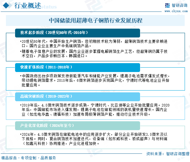 中国储能用超薄电子铜箔行业历经从技术引进到自主创新的跨越式发展:早期受制于海外技术垄断,超薄铜箔依赖进口,直至2010年后政策驱动下国内企业突破6微米电解铜箔工艺,伴随新能源汽车与储能市场爆发实现产能与技术的双重跃升;2019年起行业向4.5微米极薄规格加速迭代,并同步推进复合铜箔产业化布局,2024年已形成以4.5微米为主流、复合铜箔技术蓄势待发的产品矩阵,通过产业链协同与全球化布局,在超薄化、轻量化、高安全领域持续引领全球储能材料技术变革,当前正从产能规模优势向高端技术标准主导权深化迈进。