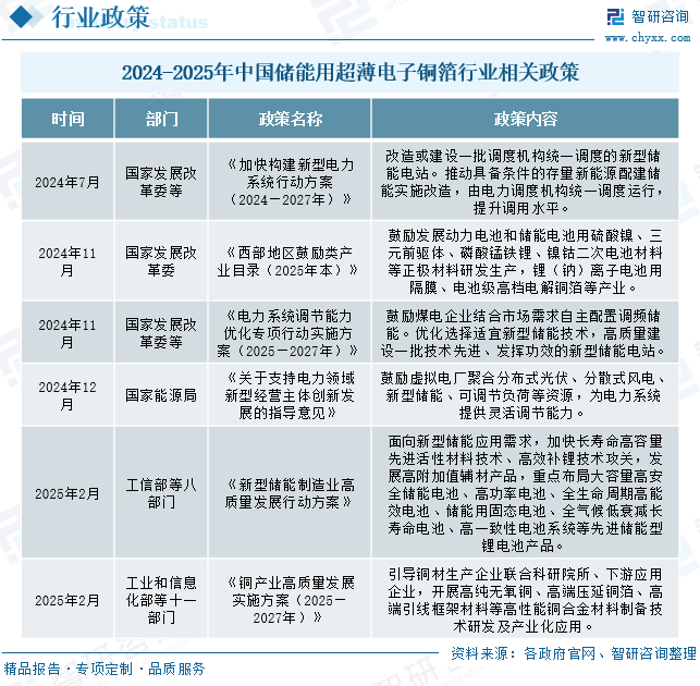近年来,在国家"双碳"战略和新能源产业快速发展的双重推动下,我国密集出台了一系列支持储能产业和铜材料产业发展的政策文件,为超薄电子铜箔行业创造了良好的政策环境。例如:《加快构建新型电力系统行动方案(2024—2027年)》《西部地区鼓励类产业目录(2025年本)》《电力系统调节能力优化专项行动实施方案(2025—2027年)》《关于支持电力领域新型经营主体创新发展的指导意见》《新型储能制造业高质量发展行动方案》《铜产业高质量发展实施方案(2025—2027年)》。其中,《西部地区鼓励类产业目录(2025年本)》明确将电池级高档电解铜箔列为重点鼓励发展产业,与正极材料、隔膜等关键材料并列;《铜产业高质量发展实施方案(2025—2027年)》则着重强调要推动产学研协同,加快高纯无氧铜、高端压延铜箔等高性能铜材料的研发和产业化。这一系列政策组合拳,不仅为储能用超薄电子铜箔行业提供了明确的发展路径,更在技术研发、产业布局、市场应用等多个维度形成了强有力的政策支撑体系,为行业高质量发展奠定了坚实基础。