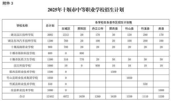 2025年十堰市高中阶段学校招生总计划为41340人,其中普通高中招生计划为27038人(招生学校和分校计划见附件1),综合高中招生计划为1900人(招生学校和分校计划见附件2),中等职业学校招生计划为12402人(招生学校和分校计划见附件3)。