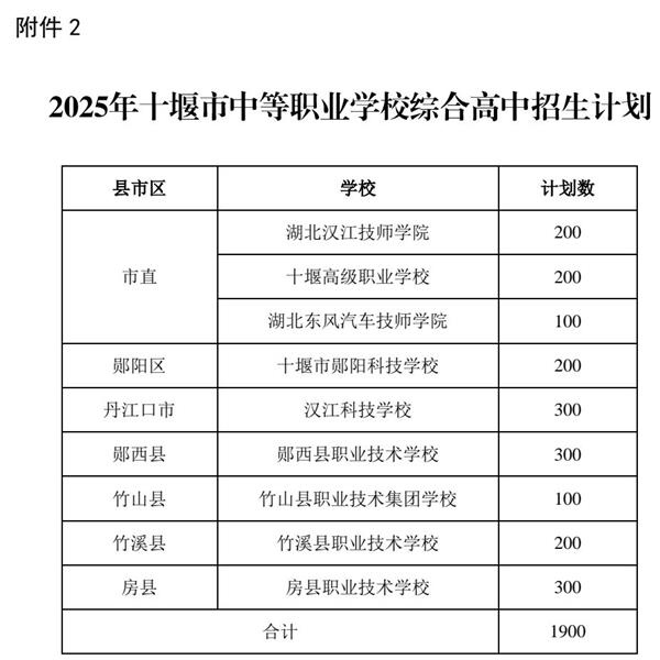 湖北汉江技师学院、湖北东风汽车技师学院和十堰高级职业学校综合高中计划面向城区(含郧阳区)招生。