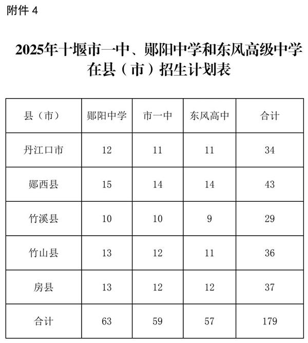十堰市一中、郧阳中学和东风高级中学在十堰城区的指令计划中单列50%为分配生计划,把分配生计划分配到指定初中学校(具体分配生计划见附件5)。