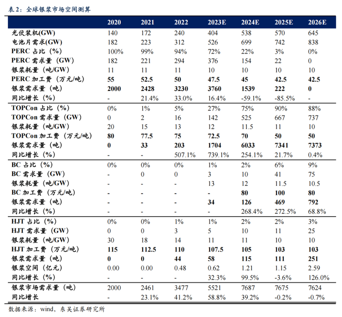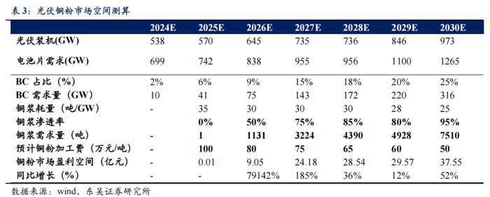 市场空间广阔,有望贡献第二成长曲线。由于铜浆导电性较银浆略低,因此铜浆单GW耗量更高。若铜浆量产突破,仅考虑BC电池场景,预计2026年有望贡献千吨级市场空间;随光伏需求增长+铜浆渗透率提升,预计2030年市场体量有望达7000吨+。