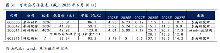 预计公司2025-2027年归母净利润为2.5/5/6.5亿元,同增185%/100%/30%,对应EPS为0.95/1.91/2.48元。我们给予聚和材料、帝科股份、铂科新材30%、30%和40%权重。如下图所示,可比公司的2026年动态PE加权均值为15倍。结合公司电子粉体龙头企业地位,我们给予公司2026年30xPE,对应目标价57.3元,首次覆盖,给予“买入”评级。