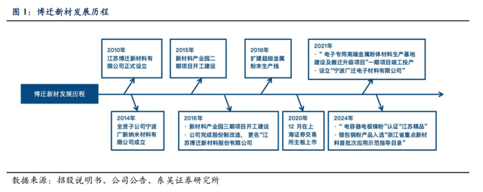 公司深耕纳米金属粉体材料领域,加速向新能源领域延伸。江苏博迁新材料股份有限公司前身江苏广博纳米科技,公司成立于2010年6月,早期聚焦纳米金属粉体技术研发,突破液相还原法制备小径粒镍粉的产业化难题,奠定行业地位。2016年完成股份制改造并更名,引入宁波众智聚成创投等战略投资者,注册资本增至1.1亿元,推进产品多元化。2020年12月登陆上交所主板(代码:605376),募资扩建年产1,200吨纳米金属粉体产能,加速全球化布局。