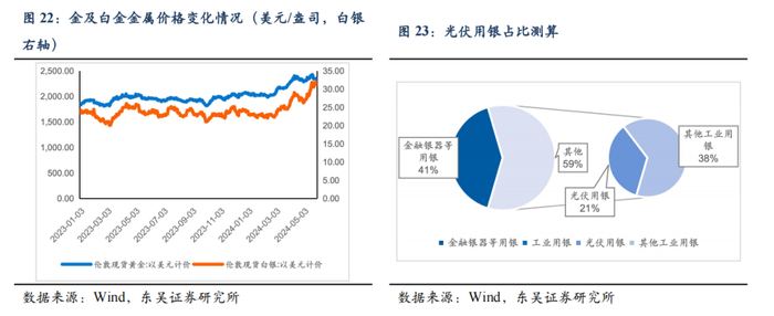 贵金属价格整体处于高位,工业用银持续增加,助推银价上涨。23年全球白银年产量约3.1万吨/需求量约3.7万吨,其中金融投资需求等约1.7万吨;工业用银需求约2万吨,其中光伏约占6000吨,预计24-25年年光伏用银7500-8000吨,光伏用银持续提升,银价整体维持高位。