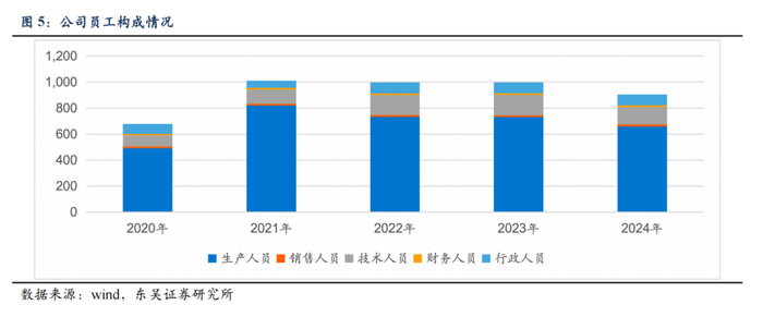 员工结构呈现研发强化与效率提升双轨并进态势。技术人员占比从2020年12.7%升至2024年14.9%,核心投向细粒径镍粉迭代及光伏银铜浆料开发,2023年新增研发人员34人后2024年优化至135人, 研发人均投入达37.3万元(总投入0.50亿元),显著高于行业平均。生产人员占比维持高位(2024年72.8%),但人均创收同比提升51.2%至104.57万元,体现产线自动化升级成效。高管团队稳定且技术背景突出,陈钢强博士领衔材料专家持续研究,员工管理高效。
