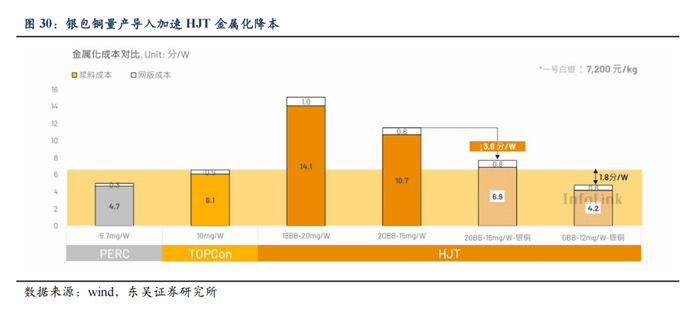 无银/少银化趋势明确。银价不断上升,即使单瓦银耗量不断减少,但金属化占电池片成本占比不断提升,0BB,叠栅,铜电镀,银包铜等无银/少银技术层出不穷。少银/无银化是大势所趋。