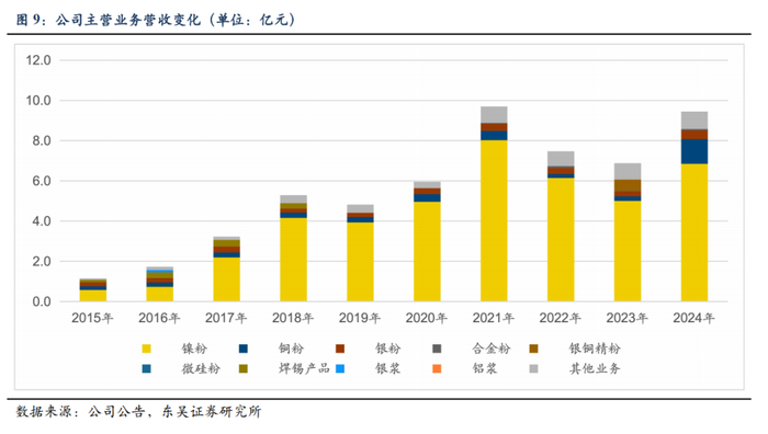 镍粉为核心业务,光伏银包铜粉占比逐渐提升。公司镍粉2021年贡献收入8.02亿元(占比82.6%),但2023年收入从8.02亿缩减至5亿(占比72.6%),毛利率从43.3%降至18.4%,2024年回升至6.85亿元(占比72.5%),毛利率亦呈现修复。铜粉成为增长亮点,2024年收入1.22亿元(占比12.9%),同比增长431%。银粉与合金粉规模较小但技术突破显著,2023年银粉毛利率修复至15.1%。