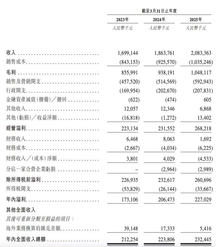 根据招股书,颖通控股在2023-2025财年(截至每年3月31日)的收入分别为16.99亿元、18.64亿元和20.83亿元人民币,颖通控股实现连续三年的、稳健的营收增长,年复合增长率达10.73%;同期净利润从1.73亿元增长至2.27亿元,年复合增长率高达14.52%。这一优异的财务表现无疑增强了投资者信心,也为上市提供了坚实的业绩支撑。