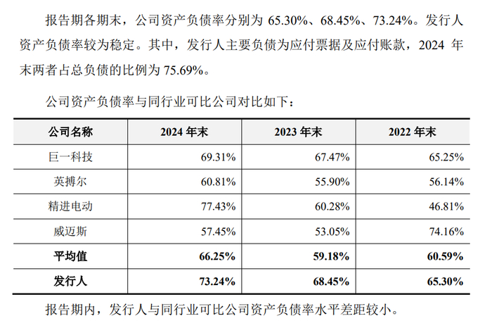 应付类项目的大幅攀升推高了联合动力的资产负债率。报告期各期末,公司资产负债率分别为 65.30%、68.45%和73.24%,均高于可比公司均值;流动比率分别为 1.22 倍、1.16 倍和 1.14 倍,公司资产负债率水平较高,流动比率较同行业上市公司的平均水平偏低。