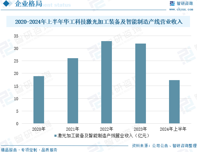 华工科技产业股份有限公司是集“研发、生产、销售、服务”为一体的高科技企业集团。成立以来,公司坚持以“激光技术及其应用”为主业,专注新技术、新市场、新领域深层探索,锚定新能源与数字赋能两大赛道,保持稳中有进的发展态势。经过多年的技术、产品积淀,形成了以激光加工技术为重要支撑的智能制造装备业务,以信息通信技术为重要支撑的光联接、无线联接业务,以敏感电子技术为重要支撑的传感器业务三大业务格局,公司拥有国内领先的激光装备研发、制造技术和工业激光领域全产业链优势,致力于为工业制造领域提供广泛而全面的激光智能制造解决方案;致力于为3C电子、汽车电子及新能源、PCB微电子、半导体面板、日用消费品等行业提供“激光+智能制造”行业综合性解决方案。数据显示,2024年上半年,华工科技激光加工装备及智能制造产线营业收入为17.27亿元,同比增长17.24%。